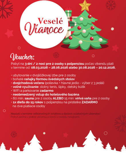 Hľadáte tip na Vianočný darček? Darčekové poukazy ktoré si pre Vás pripravil Relax Hotel*** FIM môžu byť pre Vás tou správnou voľbou! Potešte svojich blízkych víkendovýmpobytomplnýmrelaxu v srdci Nízkych Tatier. Stačí vyplniť formulár a my Vám poukaz s menom obdarovaného zašleme vytlačený poštou na adresu, pripravený na darovanie pod stromček. Majiteľ poukazu si následne môže vybrať termín ktorý mu vyhovuje a zarezervovať si pobyt pre 2 osoby s dieťaťom do 15 rokov ZADARMO!